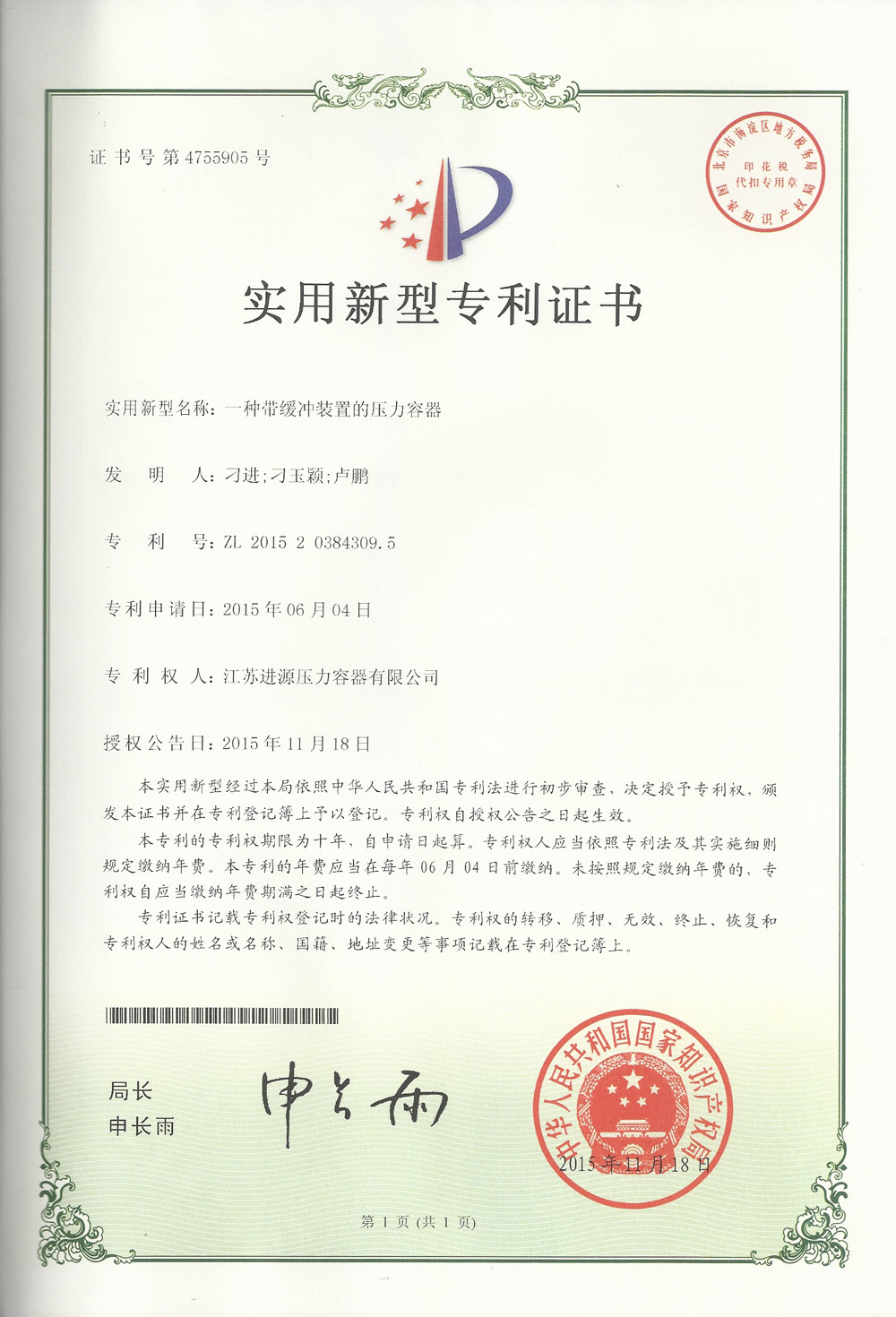 帶緩沖裝置壓力容器專利